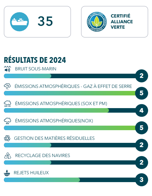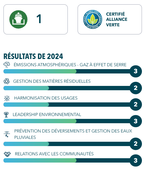 Certification Alliance verte : À titre de membre fondateur de l’Alliance verte, nous orientons nos actions afin d’améliorer de façon continue nos pratiques et nos opérations. L’Alliance verte est le principal programme de certification environnementale pour l’industrie maritime nord-américaine. C’est une initiative volontaire qui permet à ses participants d’améliorer leur performance environnementale en ciblant les enjeux clés liés à la protection de la biodiversité, la qualité de l’air, de l’eau et des sols, ainsi qu’aux relations avec les communautés.